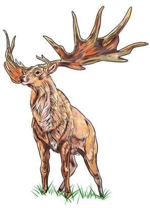 Megaloceros (do grego "grande chifre") era também chamado de alce-gigante. Seus chifres, que alcançavam até 3,5m de ponta a ponta, pesavam cerca de 40kg. Provavelmente teve sua extinção acelerada pelo tamanho excessivo dos chifres. Perseguido por outros animais através da floresta, o alce acabava sendo apanhado, pois a abertura exagerada dos chifres o prendia na vegetação (em campo aberto era menos problemático). Algumas vezes o grupo de alces-gigantes poderia escapar ao ataque com um golpe bem aplicado dos chifres nos lobos, leões, tigres-dente-de-sabre e outros ferozes. As galhas eram usadas também no ritual de acasalamento, através da luta entre dois pretendentes pela mesma fêmea. Viveu na Europa, Ásia e Norte da África. Alimentava-se de vegetais. Tinha 3m de altura do chão ao ombro e podia pesar entre 540kg - 600kg. As grandes espécimes poderiam atingir cerca de 700kg. Os últimos vestígios apontaram que a espécie datava do período de 7.700 anos na era Cenozoica.
